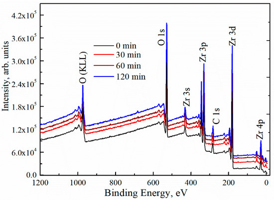 X-ray photoelectron spectroscopy (XPS) survey spectra of ZrOx thin films at different UV–ozone treatment times.