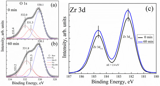 Figure 4c shows the corresponding XPS spectra of the Zr 3d core level for both UVO-0 and UVO-60 ZrOx thin films. All the films showed the typical Zr 3d spectra with spin-orbit doublets (d5/2 = 182.3 eV, and d3/2 = 184.7 eV) separated by ~2.4 eV, which suggests the formation of ZrOx thin films [17,43]. A similar BE has been reported for Zr 3d in our previous study on Zr-doped TiO2 films by spray pyrolysis [17].