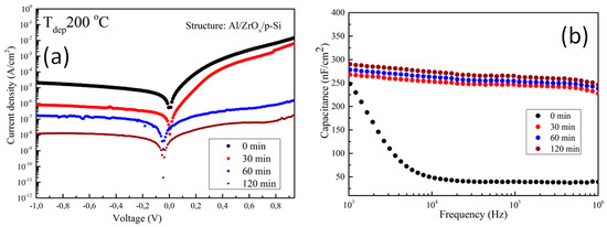 Electrical characterization of the metal insulator semiconductor (MIS) device made from ZrOx dielectric: (a) current–voltage curve under positive and negative biases; and (b) capacitance–frequency dispersion curve in the range between 1 kHz and 1 MHz at different UV–ozone treatment times. The device has an Al/ZrOx/p–Si structure.