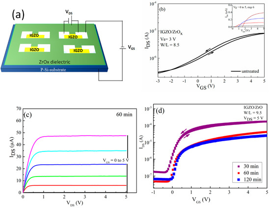 This result concurs with the wettability measurement as well as the Schottky barrier determination, demonstrating an increase in the energy barrier height caused by changes in the surface potential of the ZrOx dielectric layer during the UV-ozone treatment. Furthermore, the magnitudes of the on–off current ratio, Ion/Ioff, are 1 × 103, 0.4 × 104, and 1 × 104 when the UVO treatment time increases from 30, 60 to 120 min, respectively. The Figure 6c shows the typical output characteristic curve for the 60 min UVO-treated ZrOx gate dielectric TFT. It can be seen that the UVO-treated TFTs exhibit typical n-type channel conduction behavior with a clear pinch-off voltage and current saturation.