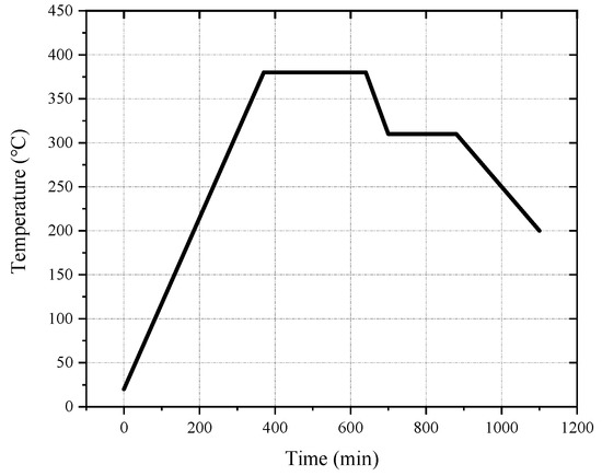 The melting temperature of PTFE is 327 °C. When the temperature exceeds 400 °C, PTFE begins to decompose. When the temperature exceeds 500 °C, PTFE decomposes rapidly. It is generally assumed that the optimum sintering temperature is 380 °C [6,28,29,30]. Based on the size of the sample and referring to other research [15,17,30], the design sintering process was as follows: the oven temperature was ramped up to 380 °C at a rate of approximately 55 °C/h. Following this, the sintering temperature was maintained at 380 °C for 1–6 h, depending on the size of the sample. Then, the temperature was reduced to 315 °C at a rate of 55 °C/h and maintained for 2 h. Finally, the sample was cooled to room temperature at a rate not exceeding 55 °C/h. The sintering curve is shown in Figure 1.