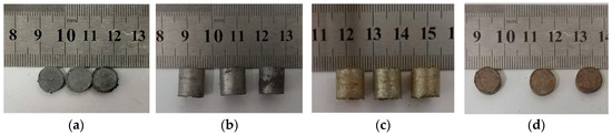 (4) Material sintering. The PTFE material as the matrix determines the main mechanical properties of the reactive material. Through the sintering process, the PTFE can be melted and recrystallized, and the interface between particles disappears due to diffusion. PTFE turns from particles into a dense continuum, and the strength of PTFE is greatly improved [28]. After sintering, PTFE encapsulates the active metal. It can isolate the metal from the external environment, thereby reducing the chance of the active metal being oxidized. In order to avoid the reaction of the reactive material, sintering needs to be carried out in a vacuum or inert gas environment.