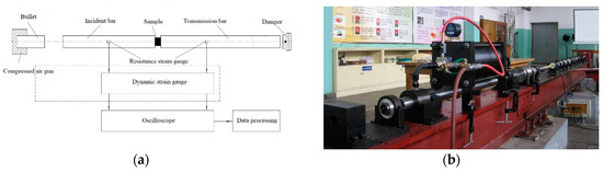 Split Hopkinson pressure bar (SHPB) system. (a) SHPB schematic; (b) actual device.