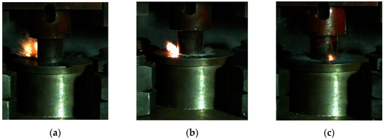 The phenomenon of a drop hammer impacting the reactive material at critical height: (a) material No. 1; (b) material No. 2; (c) material No. 3.