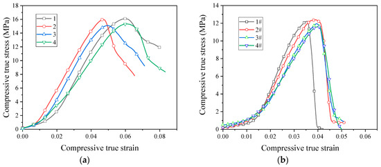 Quasi-static compressive stress–strain curves of unsintered reactive materials: (a) micron-sized reactive materials; (b) nano-sized reactive materials.