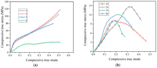 The quasi-static stress–strain curve of the sintered PTFE/Al/CuO reactive material is shown in Figure 8. After sintering, the strength of the PTFE/Al/CuO reactive material obviously increased. Figure 8a shows that the sintered micron-sized reactive material exhibited obvious elastic–plastic properties during compression. In particular, materials No. 1 and No. 2 did not fail during quasi-static compression. This indicates that, after sintering, the ductility of micron-sized PTFE reactive materials greatly improved. These materials had no obvious yielding phenomenon, and the stress value when 0.2% plastic strain occurred was taken as yield strength. The yield strength of materials No. 1 to No. 3 increased sequentially, but the strength of No. 4 was significantly lower than the other three materials. This indicates that the addition of Al/CuO thermite at an appropriate amount can increase the strength of the reactive material, while excess Al/CuO thermite reduces the strength of the material. When the content of the Al/CuO thermite reached 25%, the yield strength of the reactive material could be increased to 30.4 MPa. However, the plastic modulus of the reactive material then began decreasing. When the content of the thermite further increased, the elastic modulus of the reactive material also began decreasing. We speculate that this may be because a large amount of Al/CuO thermite promotes the decomposition of PTFE during the sintering process, which causes the material to produce more pores.