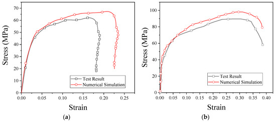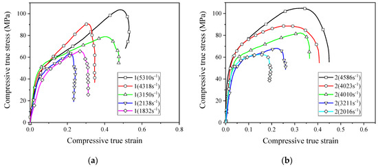 Stress–strain curves obtained from the numerical simulation and SHPB test: (a) strain rate of 2051 s−1; (b) strain rate of 3758 s−1.