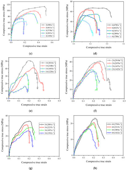 The stress–strain curves of reactive materials at different strain rates; (a) Material No. 1; (b) material No. 2; (c) material No. 3; (d) material No. 4; (e) material No. 1#; (f) material No. 2#; (g) material No. 3#; (h) material No. 4#.