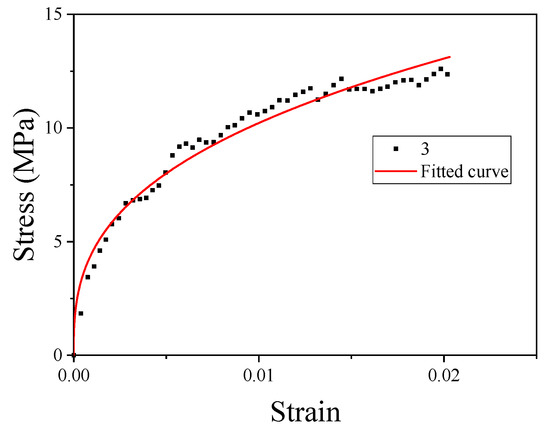 where the constant A is the basic yield stress at low strains. The yield strength of material No. 3 could be obtained from Table 3. The plastic section of the quasi-static curve of material No. 3 was taken to fit B and n. The fitting curve is shown in Figure 10.