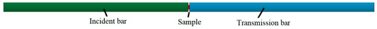 Firstly, we built a model according to the actual dimensions of the test device and the sample. Both the incident bar and the transmission bar were cylinders with a diameter of 20 mm. The dimensions of the sample were ∅10 mm × 3 mm. In order to avoid interference from the free-end reflected signal, the length of the incident bar was set to 1000 mm, and the length of the transmission bar was set to 400 mm. The final model image is shown in Figure 11.