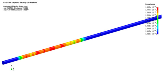 The software HyperMesh was used to divide the mesh. The mesh elements were all SOLID164. This is an eight-node hexahedron element. The grid size of the cross-section of the bar was 0.4 mm. As the SHPB experiment is a one-dimensional mechanics process in design, the axial mesh could be simplified appropriately. The size of the grid in the axial direction was 1 mm, which reduced the amount of calculation required. The boundary was consistent with reality and was a free boundary. Both the incident bar and the transmission bar were Al bars, which were also defined in the simulation using the JC constitutive model. The model parameters of the bar are shown in Table 5.