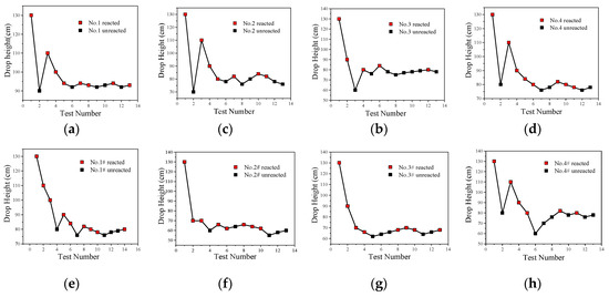 The impact-induced reaction characteristics of PTFE/Al/CuO reactive materials were studied using the drop hammer test. The dimensions of the samples were ∅10 ± 0.4 mm × 3 ± 0.2 mm, and the minimum height change interval of the drop hammer was 10 mm. In the experiment, if the reactive material reacted, the height of the drop hammer was lowered, while, if there was no reaction, the height of the drop hammer was increased. Test data and results are shown in Figure 14 and Figure 15, respectively.