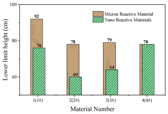 In order to make the Al/CuO thermite play a better role, the micron-sized PTFE/Al was replaced with nanoparticles without changing the proportion of the element of the reactive material. The lower limit height of the nano-sized reactive materials No. 1# to No. 4# changed significantly with the increase in Al/CuO thermite, which was different from the original micron-sized reactive materials. Compared to the micron-sized reactive materials, the lower limit height of the sample was reduced by up to 23% when nano-sized reactive materials were used. With the increase in Al/CuO thermite, the lower limit height of the nano-sized reactive materials firstly decreased and then increased. The test results show that the sensitivity of reactive materials was higher when the content of Al/CuO thermite was between 12.5% and 25%. At this time, the particle size of all the components in the reactive material was similar; thus, the reactive activation conditions of the reaction between CuO and Al in the reactive material were no longer different. The results also indicate that the nano-sized PTFE/Al/CuO reactive materials were easily induced by drop hammer impact when the Al content was high. Therefore, if we want to further reduce the lower limit height of the micro-sized PTFE/Al reactive materials used in the previous section, we should increase the content of nano-sized Al powder in the material.