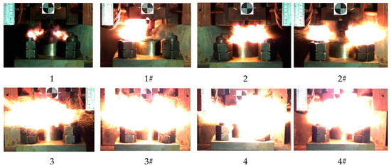 When the height of the drop hammer was much higher than the lower limit height of sample, we could observe the violent reaction phenomenon. The reaction process of the reactive material sample could be obtained completely using the high-speed camera (FPS4000). Taking reactive material 4 as an example, the reaction phenomena corresponding to a drop height of 130 cm is shown in Figure 17. At this point, the sample was subjected to a violent impact from the drop hammer, causing a severe chemical reaction. It can be observed that the reactive material was completely crushed before beginning to react, and a large fireball was quickly generated and then scattered. Although the mass of the material was less than 1 g, its energy release was considerable. The reaction duration of reactive material sample No. 4 was about 3.75 ms. Compared with general explosives, this reactive material has a lower reaction rate [33,34,35]. The reaction process of the reactive material was closer to high-speed combustion.