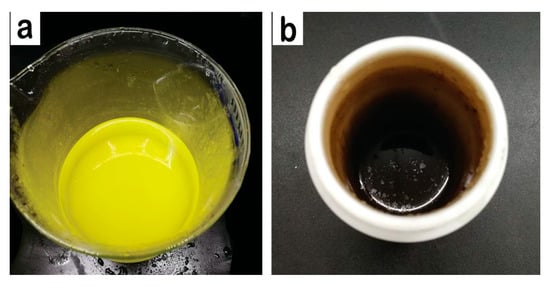 CQDs were synthesized by a hydrothermal method. Firstly, the Radiata pine woody powder (1.3 g) was dispersed into purified water (70 mL) under a strong stirring. Then, the mixture solution was transferred into a high-pressure Teflon-lined stainless-steel autoclave (100 mL, Taizhou, China) and heated at 200 °C for 8 h in an oil bath. After being cooled down to room temperature, the resultant light-yellow product (Figure 1a) was removed out from the autoclave and then filtered through a piece of microporous membrane (pore size, 0.22 µm), to remove large particles. Brown–yellow CQDs (Figure 1b) were obtained by a dialysis treatment for 48 h, with a dialysis membrane (MWCO, 500–1000 Da, Spectrum Labs, Los Angeles, CA, USA). The resulting CQDs (with a concentration of 0.1 wt.%) were stored in a refrigerator (4 °C) for later use.