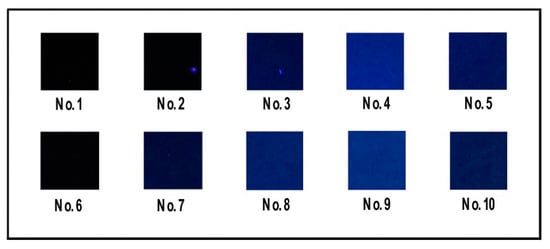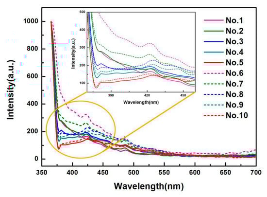 Figure 7 displays the optical performance of the prepared films with various contents of CQDs (No. 1 to No. 10), at the excitation wavelength of 365 nm. It is observed that the fluorescence spectra of all the films present a similar changing trend. The fluorescence intensity decreases significantly with the increase of emission wavelength from 350 to 375 nm, which belongs to the band of ultraviolet light. However, when the emission wavelength increases from 425 nm to 575 nm, the fluorescence intensity of the films decreases slowly in the visible light band, and tends to be almost the same, even quenching for the emission wavelength greater than 575 nm. Moreover, the fluorescence spectra are clearly visible with convex peaks in the emission wavelength of 375 to 450 nm, which is the lipid oxidation fluorescence peak. The reason is that 2p2 nonbonding electrons of the oxygen atom occur n → π * electron transition in the free hydroxyl group of the molecular conformation of PVA [54]. From this, we conclude that PVA-based films dopes with CNF and CQDs. It shows that the addition of CNF and CQDs does not affect the characteristic emission peak of PVA-based films; however, the fluorescence intensity is affected.