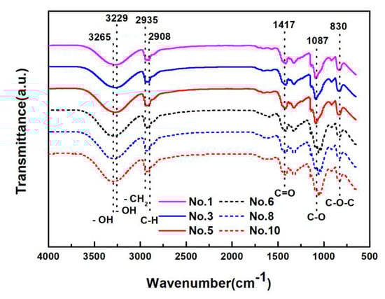 There are no significant differences among the spectra of the pure PVA, PVA/CQDs, PVA/CNF, and PVA/CNF/CQDs films (No. 1, No. 3, No5, No. 6, No. 8, and No. 10 in Table 1) in Figure 6, indicating that the introduction of CNF (0.8 wt.%) or CQDs (1 and 4 mL, as shown in Table 1) into PVA does not cause significant functional group changes in PVA films. This is due to the fact that the infrared spectra of the prepared films do not deviate greatly, because the main component of the prepared films is PVA.