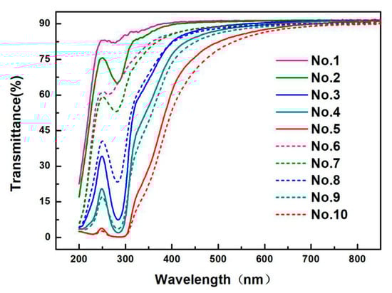 Transmittance curves of the films with different CQDs contents are shown in Figure 8. All the films (No. 1–10) show a common trend; that is, when the wavelength changes from 290 nm to 800 nm, the transmittance increases gradually until it becomes stable, reaching about 90%. It indicates that the films have worse barrier property to light after the 700 nm wavelength. However, a strong absorption peak appears at the wavelength from 240 to 290 nm, which belongs to C–H bend peak of a vibrational structure. It is due to the dipole–dipole interaction between molecules [66], or n → π * transition, because of unsaturated (C=O) bond break, as reported earlier [67].