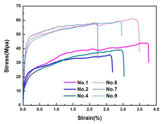 The tensile properties of the prepared PVA-based films are listed in Table 3, and the typical stress–strain curves are shown in Figure 9. Figure 10 gives SEM graphs of the fracture section of PVA, PVA/CQDs, PVA/CNF, and PVA/CNF/CQDs films. As shown in Figure 9, the preferential tensile orientation is observed in the fractured surface of all the PVA-based films, which results in the “drawing” at strains when the stress reaches a plateau before the film failure [71], as shown in Figure 9.