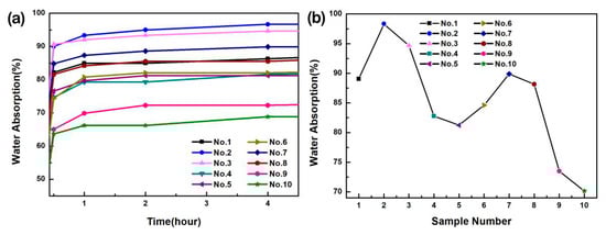 Water-barrier property of the prepared PVA-based films is shown in Figure 11a. The water absorption of films changes significantly within 0.5 h, which is due to the hydrophilic character of CNF and CQDs [75,76]. In addition, the average value of the water absorption of the PVA film (No. 1), PVA/CQDs film (No. 2 to No. 5), PVA/CNF film (No. 6), and PVA/CNF/CQDs film (No. 7 to No. 10) was 82.19%, 82.99%, 74.36%, and 77.15% after 0.5 h, reaching 89.04%, 89.25%, 84.62%, and 84.70% after 24 h, respectively. It shows that the water absorption of films is slightly unchanged after 0.5 h, which is due to saturation.