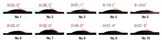 The contact angles of the 10 PVA-based composites are presented in Figure 12. The water contact angle is an important index to evaluate surface wettability of the prepared films. The contact angles of the films (No. 1 to No. 10) fall within a narrow range (18°–32°), due to the fact that the composites have a large amount of the hydrophilic groups. In contrast, the pure PVA films (No. 1) and the PVA/CNF films (No. 6) have contact angles of 23°and 23.5°, respectively, which are lower than those of the PVA-based films (28.2°) and PVA/CNF-based films (32.0°) loaded with 0.2 mL CQDs. This suggests that the wettability of PVA/CQDs films (No. 2) and PVA/CNF/CQDs films (No. 7) is worse than that of the pure PVA films and the PVA/CNF films, respectively. The change of contact angle is mainly related to the surface smoothness, porosity, pore size, and distribution of the films. This is probably due to the slight increase of surface smoothness of the prepared films after addition of CQDs (<0.2 mL), which is shown in Figure 10 [81], and is in good agreement with existing work [82]. Compared with the pure PVA films, the PVA/CQDs films (No. 3 to No. 5) show lower contact angles, which is attributed to the large amount of hydroxyl formed by high content of CQDs in the films. This happens for the same reason that the PVA/CNF/CQDs films (No. 8 to No. 10) have lower contact angles. Furthermore, the contact angles of PVA/CQDs films (No. 3 to No. 5) and PVA/CNF/CQDs films (No. 8 to No. 10) are small, which is due to no new chemical functional groups generated. This indicates that the hydrophilicity of the films is not changed with the introduction of CQDs. With the increase of CQDs content, the water contact angle decreases, which leads to the wettability of the prepared films improves, due to a change in surface properties of the blend films. Compared with the PVA/CQDs films (No. 1 to No. 5), respectively, the PVA/CNF/CQDs films (No. 6 to No. 10) present lightly larger water contact angle (<32°), due to the slightly higher surface roughness of the films (No. 6 to No. 10) after the introduction of CNF [83], which can be observed from the SEM graphs of the PVA/CNF/CQDs films in Figure 10. The results show the films after the introduction of CNF show a worse wettability.