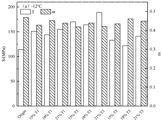 Figure 10 is shown that the of all TMA is smaller than that of original asphalt at −12 °C and −18 °C, which indicates that the ability of modified asphalt binders to resist aging can be enhanced by the addition of tourmaline modifiers. Effects of particle size of the modifier on the aging resistance can also be observed in this study. The particle size of the tourmaline modifier is smaller, the stronger the anti-aging property of the TMA. When the test temperatures were −12 °C and −18 °C, the of T2 modified asphalt binder is the lowest, which results in the best aging resistance for modified asphalt binder.