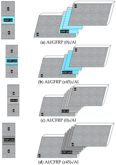 The composite panels were fabricated in an autoclave process (pressure of 0.45 MPa, under pressure of −0.08 MPa, curing temperature of 135 °C, curing time of 2 h, heating/cooling 0.033 K/s). The laminates (Figure 1) were in the following configurations for CAA+P and SAA+P. The 2 and 4 represent the number of prepreg layers in one FML configuration.