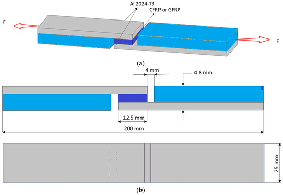 The single lap joint test tests were carried out in accordance with the ASTM D 3165–00 standard [30] on a Zwick Z150SN universal testing machine with test speed of 2 mm/min. The schematic sample view and profile with dimensions are shown in Figure 2.