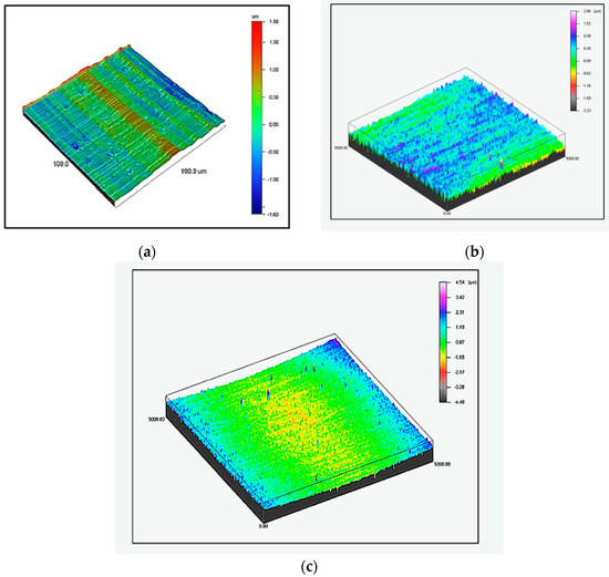 In the course of the analysis of the surface isometric view (Figure 3), it has been observed that as a result of different methods of surface preparation, the surface geometry obtained was different from the aluminum surface structure before anodizing (Figure 3a).