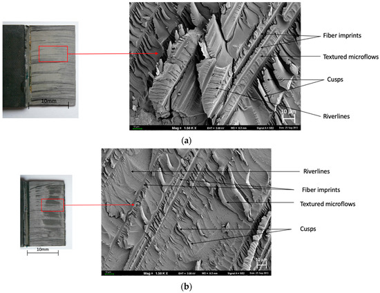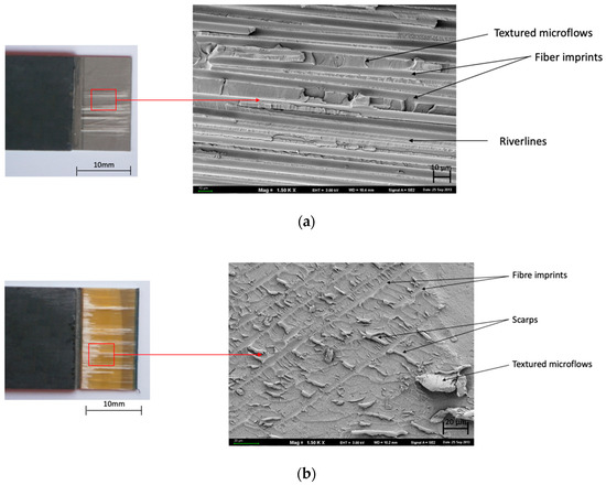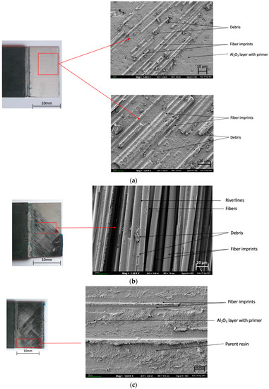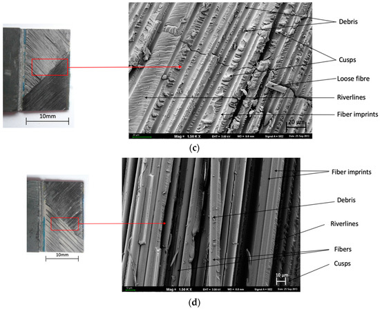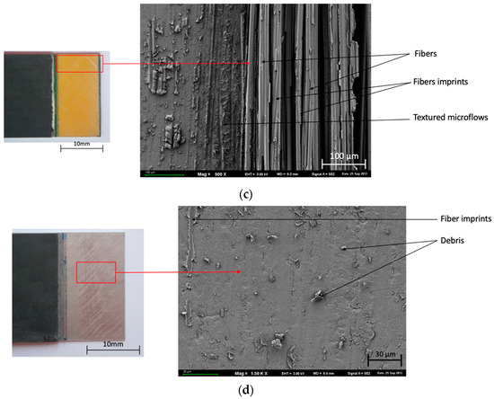 In Figure 6, the adhesive-cohesive nature of the joint “fiber imprints” and “river lines” (Figure 5a) are visible on the destruction surface. “Debris” and “fiber imprints” (Figure 6a) were observed.