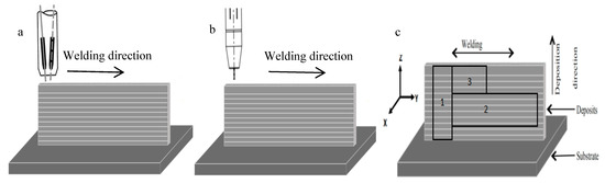 The print parameters are shown in Table 2 where I is the welding current, U is the welding voltage, νWFS is the wire feeding speed, and νTS is the torch traveling speed. The wall was heat-treated at a solution temperature of 535 °C for 600 min with a quenching water temperature of 40 °C and aging at 175 °C for 240 min.