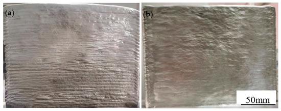 The surface morphology of single-wire and double-wire walls are shown in Figure 2. It can be seen from this figure that the surface of both processes present a silver-white metallic luster and periodic concave and convex contour caused by layer-by-layer accumulation. The contour of the double-wire wall is more uniform, and the surface is more even. This is because the interaction between the two arcs of the double-wire make the arc more stable and the molten pool formed is more uniform. The layer height of each single-wire wall is 1.2 ± 0.1 mm with a thickness of 10 ± 0.5 mm, while the layer height of each double-wire wall is 1.6 ± 0.1 mm with a thickness of 7.5 ± 0.3 mm. This is because the single wire was divided into two wires after wire feeding; the heat input of each wire was greatly reduced and the size of the weld pool formed reduced in the same way. Therefore, for a wall with the same target thickness, the total feeding speed of the double-wire is higher than that of the single-wire, so the stacking speed of the double-wire is faster, and the efficiency is higher. For large size structural parts, double-wire printing efficiency can reach 3 kg/h, greatly reducing the production cycle.