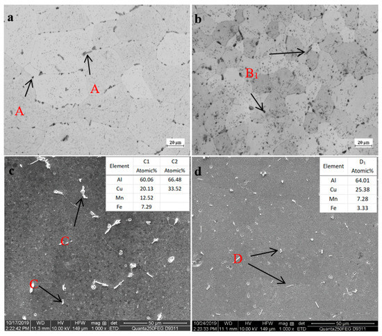 The microstructure of the single-wire and double-wire walls after T6 treatment are shown in Figure 5. As can be seen, the grains of both the single-wire and double-wire walls are isometric crystals due to the conditioning effect during the heat treatment process. The grain size of the double-wire wall is still lower than that of the single-wire wall after heat treatment due to the genetic effect of the alloy. In the microstructure of the single-wire wall, as shown in Figure 5a, besides the small black phases (A1) there are gray phases of a larger size distributed on the grain boundary (A2). The EDS energy spectrum showed that the small black phases were the re-melted T phase after heat treatment, as shown by C1 in Figure 5c, while the gray phases were θ phase, as shown by C2 in Figure 5c; the remaining θ phases were not completely dissolved in the aluminum matrix during heat treatment. In the microstructure of the double-wire wall after heat treatment, almost all are small-size black re-melted T phase, as shown in Figure 5b B1 and Figure 5d D1, indicating that the θ phases had been completely dissolved in the aluminum matrix during solid solution. Because the size of the θ phase in the double-wire wall in the as-deposited state is smaller, the contact area with the Al matrix is relatively larger, and it is thus dissolves more easily into the Al matrix during solid solution treatment. The amount of Cu dissolved in the matrix directly determines the density, size, and phase spacing of the main enhanced phase in the aging process [18]. As intermetallic compounds, the remainder of the large θ phases of the single-wire wall are the initiation position of the fracture, which have a negative effect on the mechanical properties.