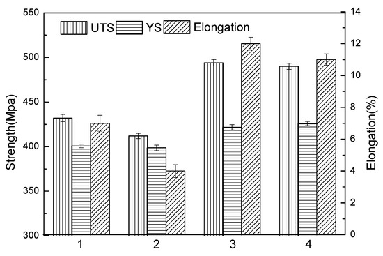 The mechanical properties of single-wire and double-wire walls after heat treatment are shown in Figure 7. Here, 1 and 2 represents the transverse mechanical and longitudinal mechanical properties of the single-wire wall, while 3 and 4 represent the transverse mechanical and longitudinal mechanical properties of the double-wire wall. It can be seen from the Figure 7 that the mechanical properties of the single-wire wall are low, and there are differences between transverse and longitudinal properties, especially in elongation. This is because a large number of pores parallel to the accumulation layer are distributed in the wall, as shown in Figure 3. These pores have a great influence on the longitudinal mechanical properties, especially elongation. Compared to a single-wire wall, the mechanical properties of the double-wire wall have greatly improved tensile strength (490 Mpa), yield strength (420 Mpa), and elongation (12%). The mechanical properties of horizonal direction and vertical direction are consistent. The improvement in the mechanical properties is, first, due to the lower heat input of the double-wire process, which brings about the effect of fine grain strengthening. Second, the θ phases in the as-deposited state of the double-wire wall are smaller in size and distributed in the dispersion, and can be completely dissolved into the matrix. In the aging process, more strengthened θ’ phases precipitate out and the role of precipitation strengthens. Finally, the internal defects of the double-wire wall are lower and, as a result, the longitudinal mechanical properties, especially the longitudinal elongation, are greatly improved.