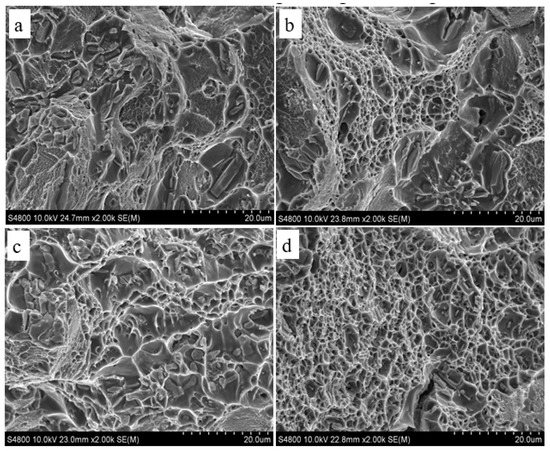 The fracture morphologies of single-wire and double-wire walls are shown in Figure 8, where (a) and (b), respectively, represent the longitudinal and transverse fracture morphologies of single-wire walls, and (c) and (d) represent the longitudinal and transverse fracture morphologies of double-wire walls. It can be seen from Figure 8 that the morphology of longitudinal fractures in the single-wire wall includes a large number of cleavage planes with only a few shallow dimples, indicating that the fracture mode is an intercrystalline brittle fracture. The transverse fracture of the single-wire wall is composed of cleavage planes and dimples, which indicates that it is a mixed-fracture mechanism. This is mainly because, after heat treatment, there are unsolved θ phases on the grain boundary which affect the toughness of the alloy as the initiation source during fracture. Both longitudinal and transverse fractures of the double-wire wall are filled with a large number of dimples which are uniform in size, which indicates that the fracture mechanism of the alloy is ductile fracture, so the double-wire wall has high strength and toughness.
