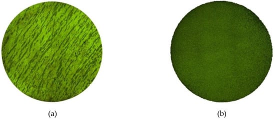 (2) Experiment method: The 16-mm diameter steel bars were cut into two groups. One set of samples was heat treated, while the other was not. For the materials that were heat treated, the room-temperature sample was first heated to 1050 °C for 100 min, kept for 30 min, and water-cooled with a cooling rate of 2 °C/s for 8 min. Then, a box-type resistance furnace (SX-8-10) was heated to 910 °C, kept for 2 h, and cooled with a furnace so that the rate of cooling was 0.006 °C/s. The heat-treated sample was finally obtained. In order to distinguish the effect of heat treatment, the microstructure was analyzed by a metallographic microscope (Leica DM2700, Beijing Ruike Zhongyi Technology Co., Ltd., Beijing, China). The combined metallographic pictures of the samples with heat treatment and without are shown in Figure 1.