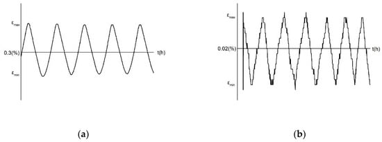 The symmetric cyclic loading waveform based on strain control. (a) Test temperature is 675 °C, (b) Test temperature is 750 °C.