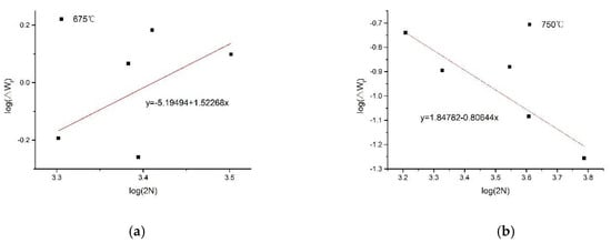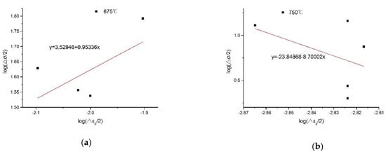 Hardening exponent solution diagram of the slope equation. (a) Test temperature is 675 °C, (b) Test temperature is 750 °C.