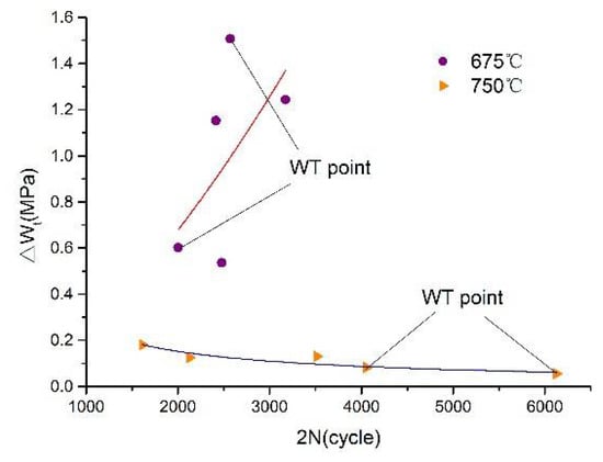 Figure 9 is a fitting curve between the prediction model based on the modified total strain energy density method and the measured values. It can be seen from the figure that the measured values are almost uniformly distributed on the upper and lower sides of the fitting curve. When the ambient temperature is 675 °C, the point without heat treatment (WT point) deviates farther, and the point with heat treatment is evenly distributed, indicating that heat treatment has a great influence on the life expectancy of the cycle fatigue test at this temperature. When the ambient temperature is 750 °C, almost all points are evenly distributed on the fitting curve. It is proven that heat treatment has less influence on cycle test results when the ambient temperature is higher than the creep temperature.