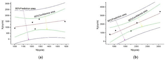 Figure 10 shows a linear fitting result of the 95% confidence interval between the predicted lifetime and measured lifetime of the total strain energy density model corrected at 675 °C and 750 °C. The fitting results at both temperatures are good—within the confidence interval—which proves that the method can be applied to life prediction of the 800H alloy.
