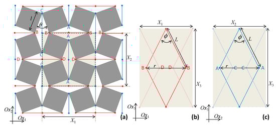 Referring to Figure 1, the system being studied may be represented through a periodic orthorhombic unit cell where the rotating squares structure is placed in the Ox1–Ox2 plane. With this alignment, the projections Xi of the unit cell in the Oxi directions are given by: