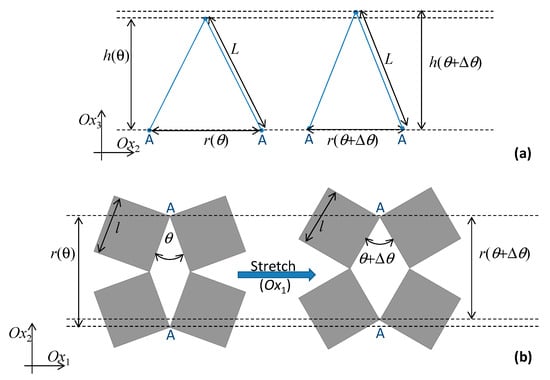 where L is the length of the additional elements forming the sides of the triangular units which move in the third dimension and r is the base length of the triangles which correspond to the aforementioned diagonals of the rhombic pores (opposite the angle π − θ) that, for θ between 0° and π/2, will be getting shorter as the rotating squares structure is pulled open (θ increases). Note that the factor of 2 is necessary, since it is being assumed that triangular units are located both above and below the plane of the ‘rotating squares’, where they could either have the same base—in which case the aforementioned triangular unit would be half of a rhombic structure, having diagonals of length r and 2h (see Figure 1)—or at different locations. The use of rhombic units, having triangular units both above and below the ‘rotating squares base’ and forming a wine-rack/Milton’s unimode-like system [,,], has the advantage that the system is easily tessellatable and will not shear. Note also that, assuming that the squares are perfectly rigid (as is normally assumed in the idealized ‘rotating squares’ model), the length r is a function of the single variable θ, the angles between the squares, and is given by: