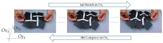 Image showing a ‘monolayer’ physical prototype (a) being stretched in the Ox1 direction or (b) compressed. Note that on stretching in Ox1, there is an increase in width in the Ox2 direction due to the rotating squares mechanism and an increase in thickness in the Ox3 direction due to the proposed triangular elongation mechanism (TEM), which is implemented here through thin flat ligaments which flex out of plane (see the animation). Note also that, despite the crudeness in construction of the physical prototype (squares made from regular sheets of c. 0.4 mm plastic, TEM implanted via a thin sheet of perforated paper c. 0.1 mm in thickness and 90 mm in length, and connections provided by regular office brass fasteners), there is still a remarkable similarity with the idealized hinging model presented above.
