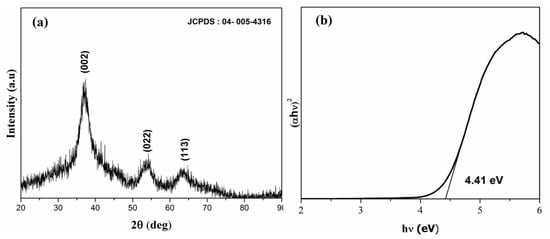 where α denotes the absorption coefficient, hν is the discrete photon energy, A is constant, Eg is the band gap, and the exponent n depends on the type of transition. The band gap was calculated to be 4.41 eV.