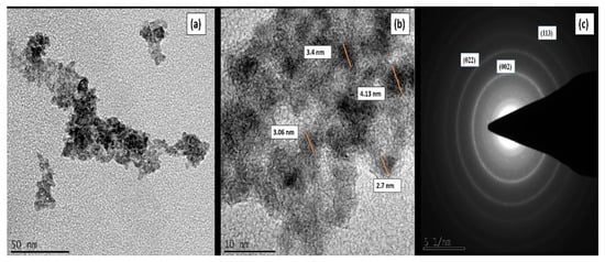 Figure 2 shows HR-TEM of MgO2. Figure 2a shows that synthesized MgO2 are highly agglomerated with nearly spherical like morphology. Figure 2b shows that the size of particles are in the range of 2.7–4.13 nm. SAED (Figure 2c) confirms that the synthesized catalyst is of nanocrytalline and shows planes corresponding to (002), (022), and (113), confirming the MgO2 phase.