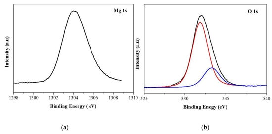 Figure 3 shows the XPS of MgO2. The binding energy of Mg1s at 1034 eV confirmed that Mg is in the +2 state (Figure 3a). O1s of MgO2 showed two peaks: the peak at the higher binding energy, 532.5 eV, corresponds to O22− species and the peak at 531.2 eV corresponds to hydroxyl species which are associated with oxygen vacancy, confirming the presence of peroxide species and oxygen vacancies on the surface of MgO2 (Figure 3b) []. The surface area of MgO2 determined by N2 adsorption–desorption isotherms was 308.32 m2/g. Measured pore volume and pore size were 0.497 cc/g and 8.07 nm, respectively (Figure S1). The results confirm MgO2 as a nanoscale photocatalyst with high specific surface area, resulting in more active sites for surface reaction.