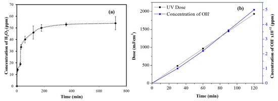Even though H2O2 was produced in the absence of irradiation, it could not degrade EE2. However, in the presence of UV light, H2O2 undergoes photolysis to produce ·OH (Equations (7)–(10)), degrading EE2 through oxidation. This is in agreement with the literature. Zhang et al. [] and Zhang and Li [] addressed the degradation of EE2 by H2O2 under UV light (254 nm) and observed that in the dark, H2O2 does not degrade EE2, but under UV light, H2O2 degrades EE2 via oxidation through OH‧ radicals: