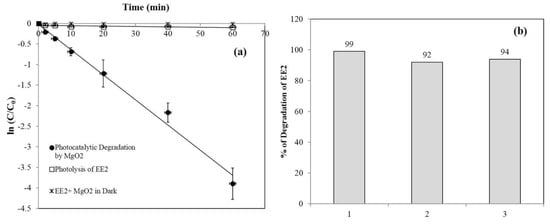 Figure 5a shows the photolytic and photocatalytic degradation of EE2 by 250 ppm MgO2. EE2 alone under LP-UV irradiation underwent 9% photolysis in 60 min, whereas in the presence of MgO2 and LP-UV irradiation, EE2 degradation reached 99% after 60 min. The rates of EE2 degradation by LP-UV and LP-UV/MgO2 were 0.001 and 0.06/min, respectively, implying that photocatalytic degradation by MgO2 plays a significant role in EE2 removal.
