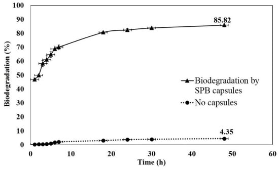 Larcher and Yargeau [] isolated Rhodococcus species from activated sludge and studied the biodegradation of 5 ppm EE2. Percent degradation by suspended cultures of R. equi, R. erythropolis, R. rhodochrous and R. zopfii after 300 h were 61, 46, 100, and 38, respectively. Yu et al. [] also isolated Rhodococcus cultures from activated sludge and studied the biodegradation of 3 ppm EE2; they observed 100% degradation after 3 days. O’Grady et al. [] studied the biodegradation of 1.4 ppm EE2 and observed 47% degradation after 13 h in the presence of co-substrate. These results suggest that biodegradation of EE2 by SBP-encapsulated R. zopfii, where significant removal of EE2 was observed within 24 h, is relatively more efficient than that by suspended Rhodococcus cultures, as reported in the literature. This strengthens the concept that the SBP membrane allows the rapid diffusion of molecules across it, and combined with the suspended form of the encapsulated bacteria within the confined environment of the capsules, results in high biodegradation rates.