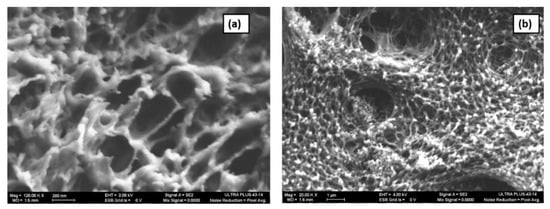 Figure 7 shows HR-SEM of the SBP capsule membrane’s outer structure and cross-section perpendicular to the capsule plane. The outer surface of the capsule is a mesh-like structure with nanopores (Figure 7a) and the cross-section at higher magnification (120 k X) shows the presence of nanopores with diameter ranging from 50 to 300 nm. This unique membrane structure is assumed to allow molecule trafficking, not only through the membrane pores, but also across the entire capsule surface. As previously indicated by Kurzbaum et al. [], this might be the reason for the phenols’ high trafficking rate and consequent rapid biodegradation rate.